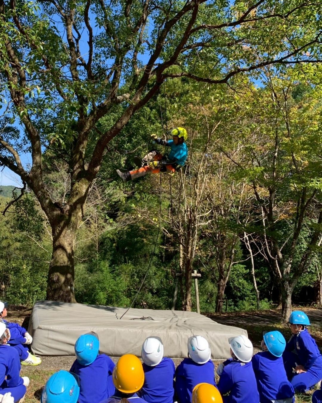 「那賀地域林業担い手対策協議会」の協力により、昨年後から実施している森林学習です。講師は、徳島県特殊伐採研究所の高木さん。高木さんの実演を見学した後は、ツリークライミング体験。重い装具をつけながらも、見事なロープワークに拍手が起こりました。そして、全員が「木のブランコ体験」を楽しみました。将来の「林業の担い手」になってくれることに期待しつつ、紅葉が始まったあいあいランドの秋を満喫。11月19日付「徳島新聞」もご覧ください。
