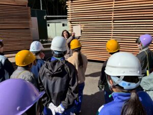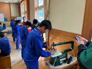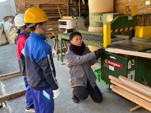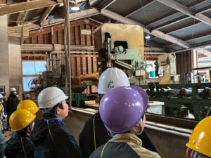 鷲敷小は、はじめにプラカードの材料を提供してくださる校区内の「新丹生谷製材所」を見学しました。10数年前に見学させていただいた当時より、敷地面積も工場棟数も増え、最新の「木材の機械乾燥」施設や「丸太を二面カット」する大型機械も備えています。ここでは、町産のスギ材を加工した様々な大きさの角材や板材を日本全国に出荷しています。子どもたちは、工場長さん等の話を聞きながら、高く積まれた木頭杉の原木や製品、一連の作業過程やさまざな大型機械、手際よく作業されている工員さんの姿等を、熱心に見学していました。最後には、自分たちが作るプラカードの横板を自ら機械を操作してカットさせていただき、喜んでいました。質問タイムでは多くの質問が出て、子どもたちの関心が高かったことがわかりました。