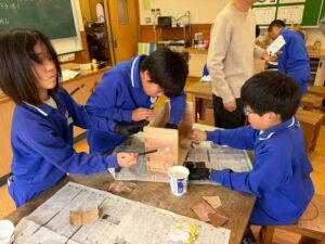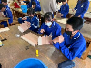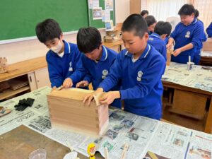 2日目は、川口さんにご指導いただきながら、組み立てていきます。本立ての裏板と横板は、木組みができるように前もって切ってくださっていて、子どもたちは釘を使わない伝統工法で組み立てていきます。本来は、切ったすぐに木組みをしていくのですが、今回はレーザーでの印字をする関係で、時間がたって板が縮んでいたため、少し隙間ができていたグループもありました。それも{木が生きている証}だと子どもたちも納得!そして、底板を釘で留めて、ニスを塗って終了。子どもたち手作りのパーツ貼りは、ニスが乾いてから行いました。「6年生を送る会」で贈った木の本立て。在校生へはサプライズだったようで、喜んでくれたと聞いています。