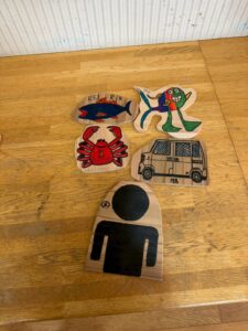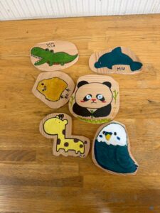 そして1日目。下書きしたイラストの外枠を電動糸のこで切っていきます。スイスイ切れる子もいれば、おもちゃ学芸員さんに教えてもらいながら切っていく子もいます。パーツが切れると、紙やすりで磨いて、油性マジックで色を塗っていきました。最後は、ニスを塗って終了。子どもの好きな動物やキャラクター等、一人2点仕上げ、なかには余った端材で、家に持って帰るパーツを作る猛者もいました。