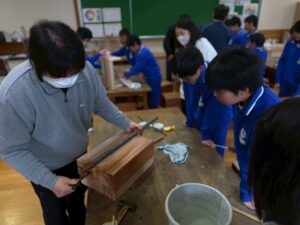 相生小学校は、学級文庫の本を置く「木の本立て」づくりです。相生の「川口指物家具工房」さんに、材料の提供と当日の指導をお願いしました。川口さんは日本伝統の「組み木工法」で、様々な家具を作っておられます。「木おけひろば」に展示している「遊山箱」は川口さん作です。
