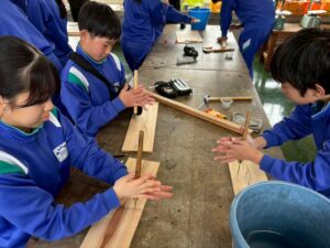 今回、提供していただいた板材は、全て「木頭杉」です。木頭杉は、日本の5大杉の一つとも言われ、雨が多く寒暖差が激しい那賀町だからこその特徴があります。温もりのある手ざわりで、香りがよく、柔らかいため加工がしやすい。それでいて丈夫で長持ちする「木頭杉」。町内には木を植え、育て、伐採し、それを製材・加工する多くの担い手がいます。町の林業の未来につなぐためにも、子どもたちには那賀町の林業の現状や可能性を伝えていきたいと思っています。