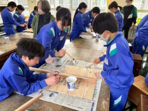 翌週は、いよいよ「プラカードづくり」本番です。まず、横板と持ち手となる縦板を釘で固定していきます。位置を決めるのに使うのが「さしがね」。初めて使う道具に戸惑いながらも、使い方を教えるとグループで協力しながら、位置を決めていきました。次は「きり」で穴をあけます。片手で穴をあけようとする子もいたのですが、これも正しい使い方をマスターしていました。交代しながら釘で留めた後は、裏側に「令和7年度卒業記念〇〇」と自分の名前を書きました。最後は、木工所で使う本格的なニスを塗って、仕上げました。後日、在校生への「引き渡し式」があり、卒業生から5年生にプラカードが渡されたそうです。このプラカードは運動会等で使われると聞いています。
