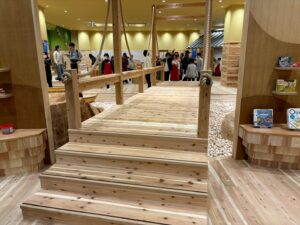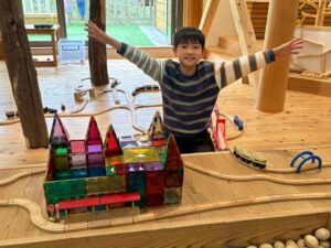 2階で人気のおもちゃ。「モクトレイン」と「マグビルド」。小学生の男の子が、2つをおもちゃを組み合わせて、町を作りました。西洋の城のようなマグビルドの建物とその周りに張り巡らされたモクトレインのレール。そのレールで遊ぶ幼児さんも多くいて、男の子も嬉しそうでした。1人で町を作った男の子の根気と豊かな発想、創造力に脱帽です。