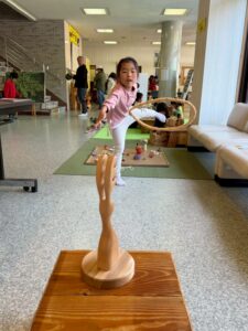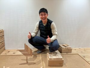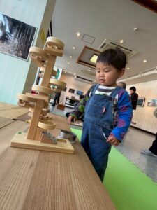 那賀町産の杉の端材から生まれた「グッド・トイ・すぎのこつみき」。当館2階にあるるのを、ご存じの方も多いと思います。子どもさんが出入りできる大きなタワーや順々に倒れていく「ナイヤガラの滝」「ヘキサゴン」等の多くの積み方があります。今回、ご家族で来られたお父さんが挑戦されたのが、「1本足で立つ不思議な積み木」。簡単にできそうで、なかなかできない。私も時々挑戦するのですが、10回に1回できればいい方で、最近はなかなかできませんでした。そのお父さんは3回目で見事、コンプリート。前に来館された時から挑戦したかったということで、笑顔で写真に応じてくださいました。ネットでも、多くの積み方が紹介されています。積み方が分からないときは、スタッフやおもちゃ学芸員さんにお尋ねください。